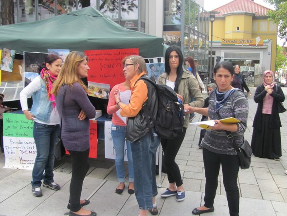 Kalabalık bir kitlenin katıldığı eylemde Almanca bildiri dağıtıldı ve Şengal’de insanlık dramı ile karşı karşıya olan halk için bağış toplandı.