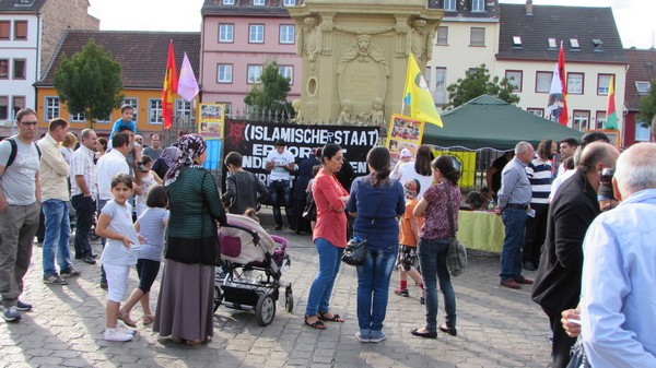 Almanya’nın Mannheim kentinde IŞİD çetelerinin saldırılarını protesto etmek için çadır kuruldu ve kitlesel bir miting düzenlendi. Kürt Toplum Merkezi Ludwigshafen/Mannheim ile Demokratik Güç birliği / Mannheim tarafından organize edilen mitingde Kürt Toplum Merkezi sözcüsü Cano Yıldız da bir konuşma yaptı. Yıldız, bugün yapılacak yürüyüşe güçlü katılım çağrısında bulundu. Demokratik Güç Birliği’nin sözcüsü de yaptığı konuşmada IŞİD’in saldırılarını kınadı ve Kürdistan ile dayanışma çağrısında bulundu.