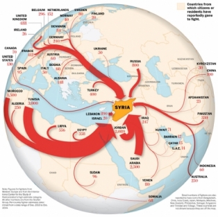 ABD'nin saygın gazetesinin yaptığı harita IŞİD'in içindeki yabancıların milliyetlerinden oluşuyor. Haritaya göre Türkiye'den IŞİD'e katılım sayısı 400 kişiyle sınırlı. Buna karşılık İslam ülkeleri dışında en çok katılım Rusya ve Avrupa ülkelerinden oluyor. Rusya'dan katılanların sayısı 800 civarında. Bunların büyük kısmının Çeçen savaşçılar olduğu tahmin ediliyor.