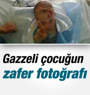 Sedye üzerinde başı yaralı olarak yatan çocuğun zafer işareti cesaretin ve zafere olan inancın timsali oldu.