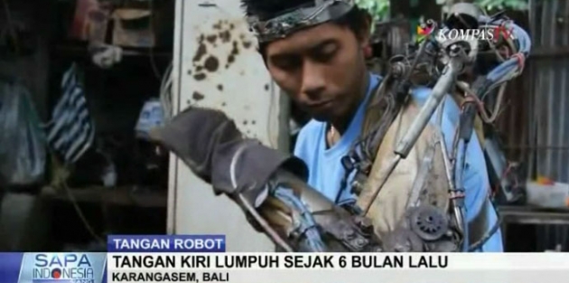 Endonezya'nın Bali kentinde altı ay önce yaşadığı beyin kanaması nedeniyle sol kolu felç olan bir kaynak işçisi, hurdalardan topladığı malzemeyle kendisine biyonik kol yaparak kolunu tekrar hareket ettirmeyi başardı.