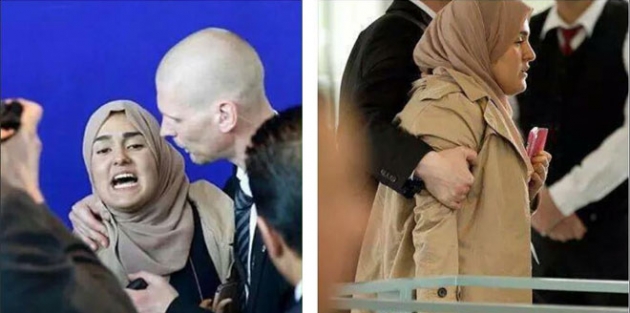 Güvenlik güçleri olaya müdahale ederken protestocu kadın salondan çıkarıldı.