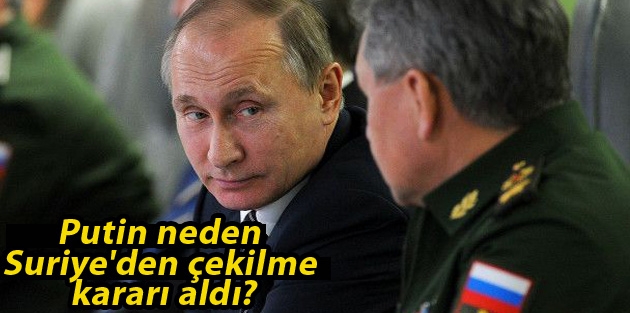 Rusya lideri, Savunma Bakanlığı’nın Suriye’de koyduğu hedefe ulaştığını, Tartus deniz üssü ve Hmeynim hava üssü korunmak kaydıyla, bugünden itibaren geri çekilmenin başlayacağını duyurdu.