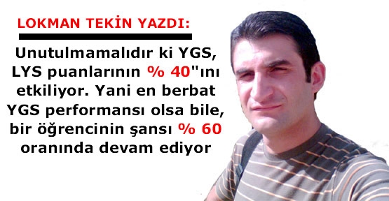 Ortalıkta YGS ile ilgili bazı spekülasyonlar da dolaşmaya başlayacaktır, bunlara enerjimizi harcayıp zaman kaybetmemeliyiz. Mesela şu kadar puan aldım ve şansım tükendi; şu bölüm için ihtimalim kalmadı, ne yaparsam yapayım şu bölüme giremem gibi doğruluğu olmayan söylemler dolaşacaktır. Unutulmamalıdır ki YGS, LYS puanlarının % 40"ını etkiliyor. Yani en berbat YGS performansı olsa bile, bir öğrencinin şansı % 60 oranında devam ediyor.