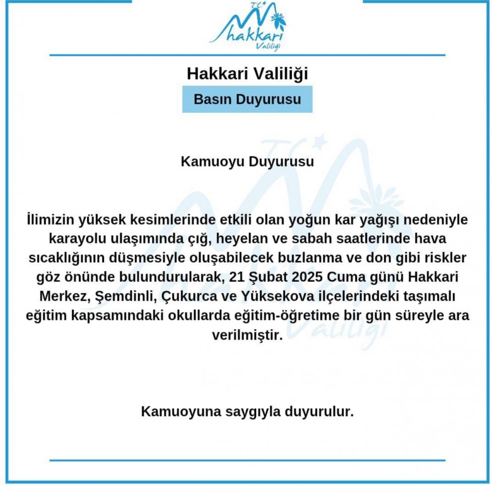 Yüksekova ilçesinde gece başlayacak kar yağışı, nedeniyle hıfzıssıhha kurulunun aldığı kararla ilçede okullar 21.02.2025 tarihiyle 1 gün süreyle taşımalı eğitime ara verildi.