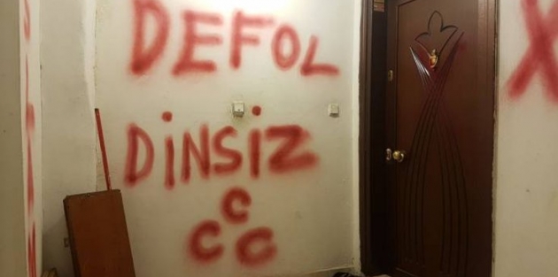 Kocasinan Mahallesi’nde ikamet eden Alevi bir ailenin kapısı ırkçı sembol ve yazılarla işaretlendi. Evin kapısına, ‘üç hilal’ sembolü ve çarpı işareti konulurken, “Defol dinsiz” ve “İslam” şeklinde yazılama yapıldı.