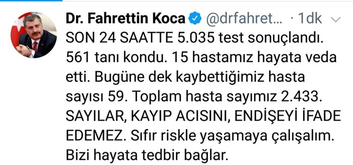 Bajan koca,''SON 24 SAATTE 5.035 test sonuçlandı. 561 tanı kondu. 15 hastamız hayata veda etti. Bugüne dek kaybettiğimiz hasta sayısı 59. Toplam hasta sayımız 2.433. SAYILAR, KAYIP ACISINI, ENDİŞEYİ İFADE EDEMEZ. Sıfır riskle yaşamaya çalışalım. Bizi hayata tedbir bağlar.''İfadelerini kullandı.