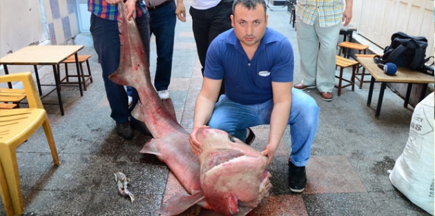 Mersin'de Akdeniz açıklarında sıcak sularda yaşayan 4 metre uzunluğunda yaklaşık 400 kilo ağırlığında camgöz cinsi köpek balığı yakalandı. Yakalanan dev köpek balığı, avlanma yasağının devam etmesi nedeniyle Akdeniz'in 12 mil açığında uluslararası sularda avlamayı sürdüren Mersinli balıkçıların, bu ay içinde ağına takılan 15. köpek balığı oldu. Balık Pazarı Derneği Başkan Yardımcısı Adnan Polat, gece yarısı ağlarına takılan camgöz cinsi köpek balığını tekneye çekmekte oldukça zorlandıklarını söyledi.