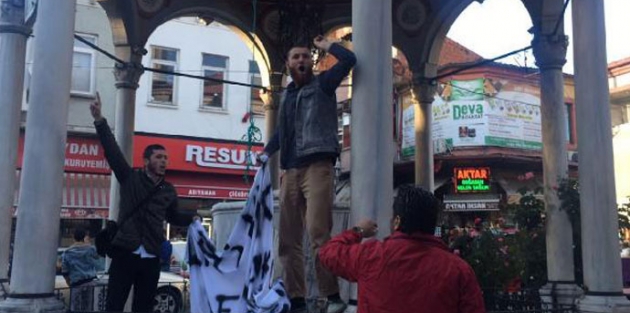 Pankartı gören bazı vatandaşlar, gençlere tepki gösterdi. Üç genç ile vatandaşlar arasında yaşanan gerginliğin ardından bölgeye çok sayıda polis ekibi sevk edildi. Şadırvana asılan pankart polis tarafından sökülürken, gençler de tekbir getirerek olaya tepki gösterdi. Gözaltına alınmak istenen gençlerle polis arasında arbede yaşandı. Şadırvanın beton bloklarına tutunan gençler polislere direnirken içlerinden biri "Gökteki Allah'ı şahit tutarız ki; bunlar bize adam değilsiniz demek istiyor" dedi.