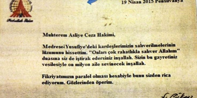 15 Temmuz darbe girişiminden sonra bu örgütün medya yapılanması kapsamında 52 kişi hakkında gözaltı kararı verildiğini, gözaltına alınanlar arasında Zaman Gazetesi’nde Görsel Yönetmen ve Grafik Tasarım Sorumlusu Fevzi Yazıcı’nın da bulunduğunu belirten Başsavcı İrfan Fidan şunları söyledi: “Bu şahsın evinde yapılan aramada dijital dokümanlar, bilgi ve belgeler ele geçirildi. Bu dokümanların çözümü devam ederken FETÖ elebaşısına ait olduğu tespit edilen bir mektup ele geçirildi. Bu mektubun tarihi çok önemli. Bu terörist başının örgüt üyelerine verdiği birebir talimatın en somut örneğidir. Bu talimatı alan örgüt yöneticileri hakimler Mustafa Başer ve Metin Özçelik, 25 Nisan 2015’te aralarında Ali Fuat Yılmazer, Ömer Köse, Yurt Atayün, Yasin Topçu ve Hüseyin Korkmaz hakkında tahliye kararı vermişlerdir. Ancak 10 Sulh Hakimliğince bu kararlar yok hükümde sayılarak tahliyeleri engellenmiştir.”