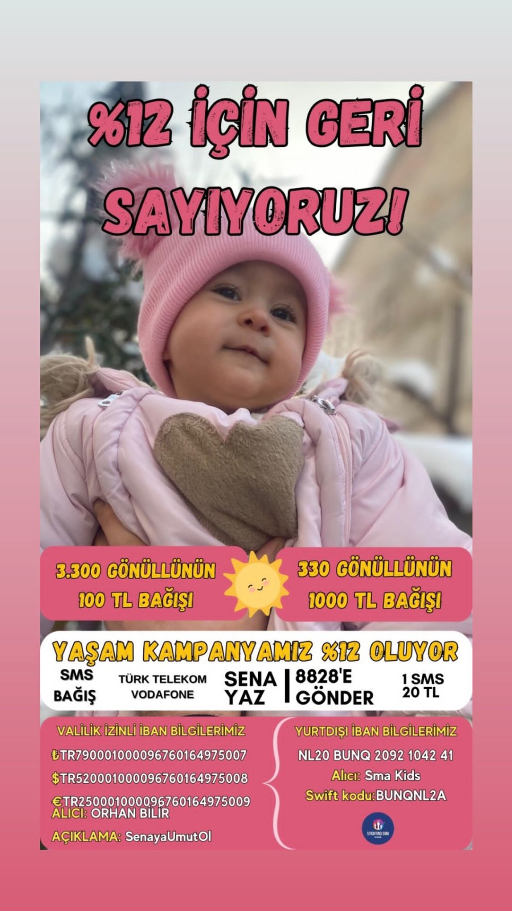 Yaşamak için hayırseverlere haykıran Sena bebek, ''18 Mart 2023 Van’da doğdum. Tüm ailem ve sevdiklerim dünyaya gelişimin heyecanını yaşamaya doyamamışken minicik ömrümün 9. gününde SMA Tip 1 Ölümcül Kas Hastalığına sahip olduğumu öğrendiler. Hastalığın hiçbir belirtisini göstermeden gen tedavisi olan Zolgensma ilacımı almam gerekiyor. Sizin yardımınız olmadan o ilacı almam mümkün değildir. Desteklerinize ihtiyacım var. Lütfen desteklerinizi esirgemeyin yaşamak diğer çocuklar gibi parklarda koşup eğlenmek istiyorum. Bağış yapıp yaşamam için umut olur musunuz?