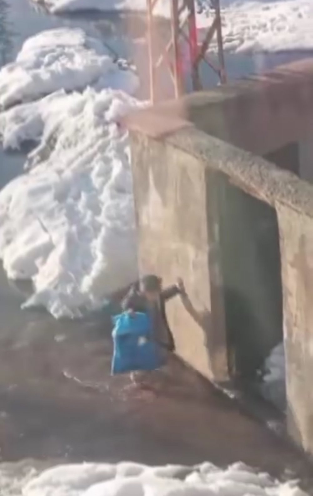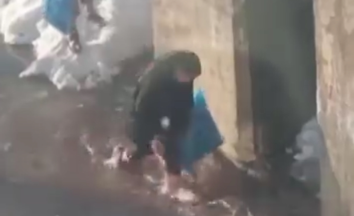 Ramazan Bayramı vesilesiyle şeker toplamak için sokağa çıkan çocukların, paçalarını sıvayarak buz gibi suyun içerisinden geçmeye çalıştığı anlar kameralara yansıdı.