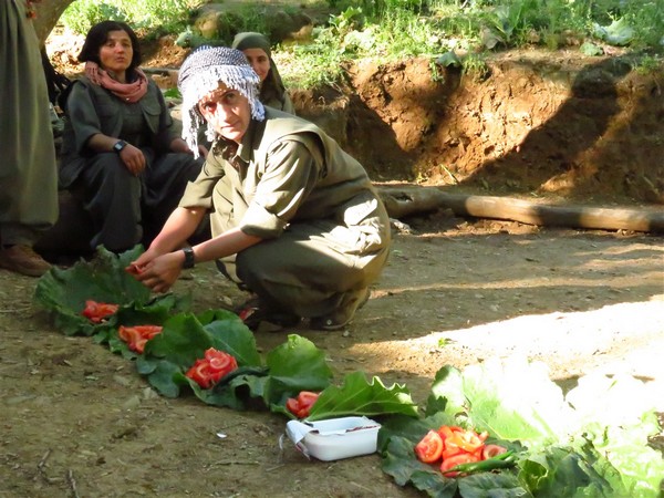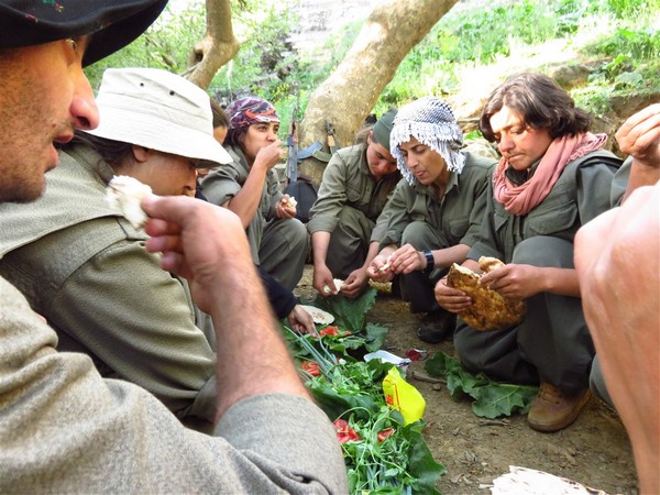 Dinlenme noktasında gördüğüm gerillaların sayısı ondu. Her bir arkadaş bir başka birimde çalışma yürüten, bir çalışma için bir araya gelen bir grup gerillaydı. Karşılaştığımız gerilla grubu karma bir gruptu. Çantalarına sıkıştırdıkları domates, biber, soğan, peynir gibi yiyeceklerle hazırlanan gerilla sofrası, yemek bir yana, rengi bile iştah açıyor. Soğuk bir su ikramından sonra herkes bir yana giderek yeşil sofrayı hazırlamaya koyuldu. Gerilla kendi içinde bir iş bölümü yapıyor ve herkes bir şeyler yapmaya çalışıyor. Biri su, diğeri ot, bir diğeri ise peyniri çantasından çıkartıyor. Hazırlanan gerilla sofrasının yanında oturan gerilla Sozdar, sorularımıza şöyle cevap veriyor. "Uzun bir yürüyüşten sonra yeşil bir sofrada ekmek yemek oldukça keyifli." Ve şu sözlerle devam ediyor. "Soframızda tırşok, domates, peynir ve biber var. Tabaklar olmadığı için de ışgın yapraklarını tabak niyetine kullanıyoruz." Rewas (ışgın) otu ekşimsi yaylalarda yetişen bir ottur. Işgın sarp yerlerde ve genelde Ortadoğu'nun birçok yerinde yetişir. Gerilla yol ve dağları iyi bildiği gibi birçok çeşit otu da tanır. Gerilla baharın gelişiyle birlikte sofralarında yeşilliği eksiltmez. Böyle güzel bir yerde böyle yeşil bir sofraya oturmamak mümkün değil. Arkadaşım Afat fotoları çekerken, Gerilla Sozdar'la sohbetimiz devam ediyor. "Rewas'ın (ışgın) hem mayhoş bir tadı verdiğinden dağ kivisi hem de soyulup yenildiği de içinde içimizde muz olarak tanımlanır" diye belirtiyor. Gerilla Sozdar, her çeşit ot tanıdığını ve severek yediğini ancak tırşok otunu çok sevdiğini gülerek söylüyor. Sozdar'la konuşmamız devam ederken yeşil sofranın hazırlanması oldukça hızlı pratik bir biçimde hazır bizi bekliyor.