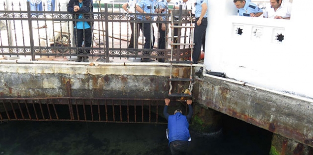 Kadıköy'de sahilde yürüdüğü sırada dengesini kaybederek denize düşen bir kişi iskelenin demirlerine tutunarak yardım bekledi. Polisin merdiven ve iple kurtarmaya çalıştığı kişi deniz polisinin gelmesiyle kurtarıldı.