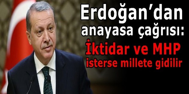 Yeni anayasa ile ilgili de konuşan Erdoğan, Milliyetçi Hareket Partisi’ne (MHP) çağrıda bulundu ve “İktidar ve MHP isterse millete gidilir,” dedi.