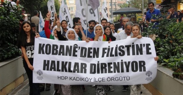 Şamil Altan’dan sonra ilk açıklamayı HDP Kadıköy İlçe Örgütü adına Ece Çetin okudu. Günlerdir Rojava’nın Kobanê katonuna Selefi gerici çetelerin saldırıları hız kesmeden sürdüğünü ifade eden Çetin, bu saldırıların esas amacının Ortadoğu halklarının özgürce yaşamasını engellemek olduğunu vurguladı. Başta Türk hükümeti olmak üzere emperyalist güçler tarafından desteklenen bu gerici çetelerin yaptığı saldırıların İsrail devletin Filistin halkına dönük saldırılarıyla hiçbir farkı olmadığını vurgulayan Çetin, sınır tanımadan direnen bu iki halkı sonuna kadar destekleyeceklerini duyurdu.