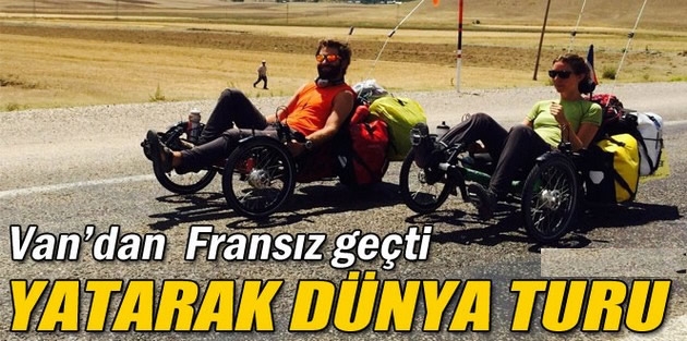 Fransa’nın Paris şehrinde yaşayan Anna ve Nicolas çifti, macera yaşamak üzere 5 ay önce 3 tekerlekli yatay bisikletleriyle dünya turuna çıktı. Sırasıyla, İtalya, Almanya, Makedonya ve Yunanistan gibi ülkeleri geçerek Türkiye’ye giriş yapan Fransız çift, dün öğle saatlerinde Van’ın Özalp ilçesine giriş yaptı. Anna ve Nicolas çift, buraya yaptıkları alışveriş sonrası yollarına devam etti. Dünya turlarını 1 yılda bitirecek olan çift, sırasıyla İran, Türkmenistan, Özbekistan, Tacikistan, Çin, Vietnam, Kamboçya ve Tayland üzerinde Hong Kong’a giderek dünya turlarını bitirecek.