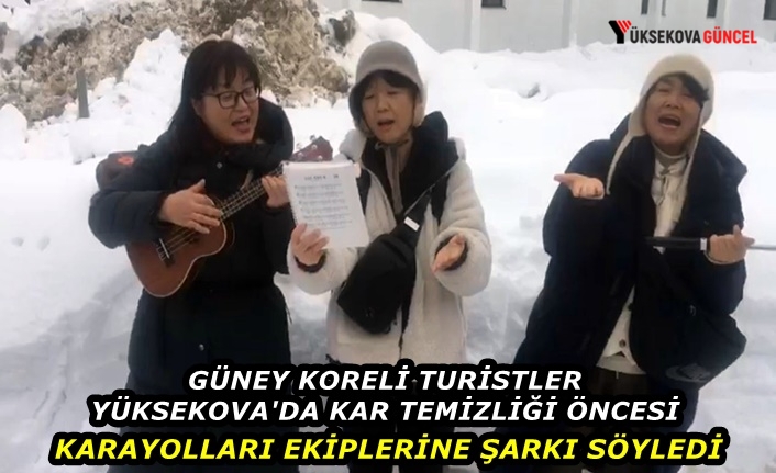 Yüksekova ilçesine gelen Güney Koreli turistler, İpekyolu Caddesi üzerinde bulunan Karayolları 117. Şube Şefliği bahçesinde kar çalışması öncesi ekiplere yöresel şarkılarını seslendirdi. Güney Koreli turistler yoğun ilgi topladı.
