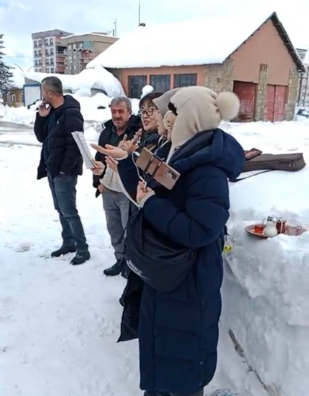 Yüksekova ilçesini ziyaret eden Güney Koreli turistler, yollarda kar temizleme çalışması öncesi Karayolları ekiplerine yöresel şarkılarını seslendirdi.