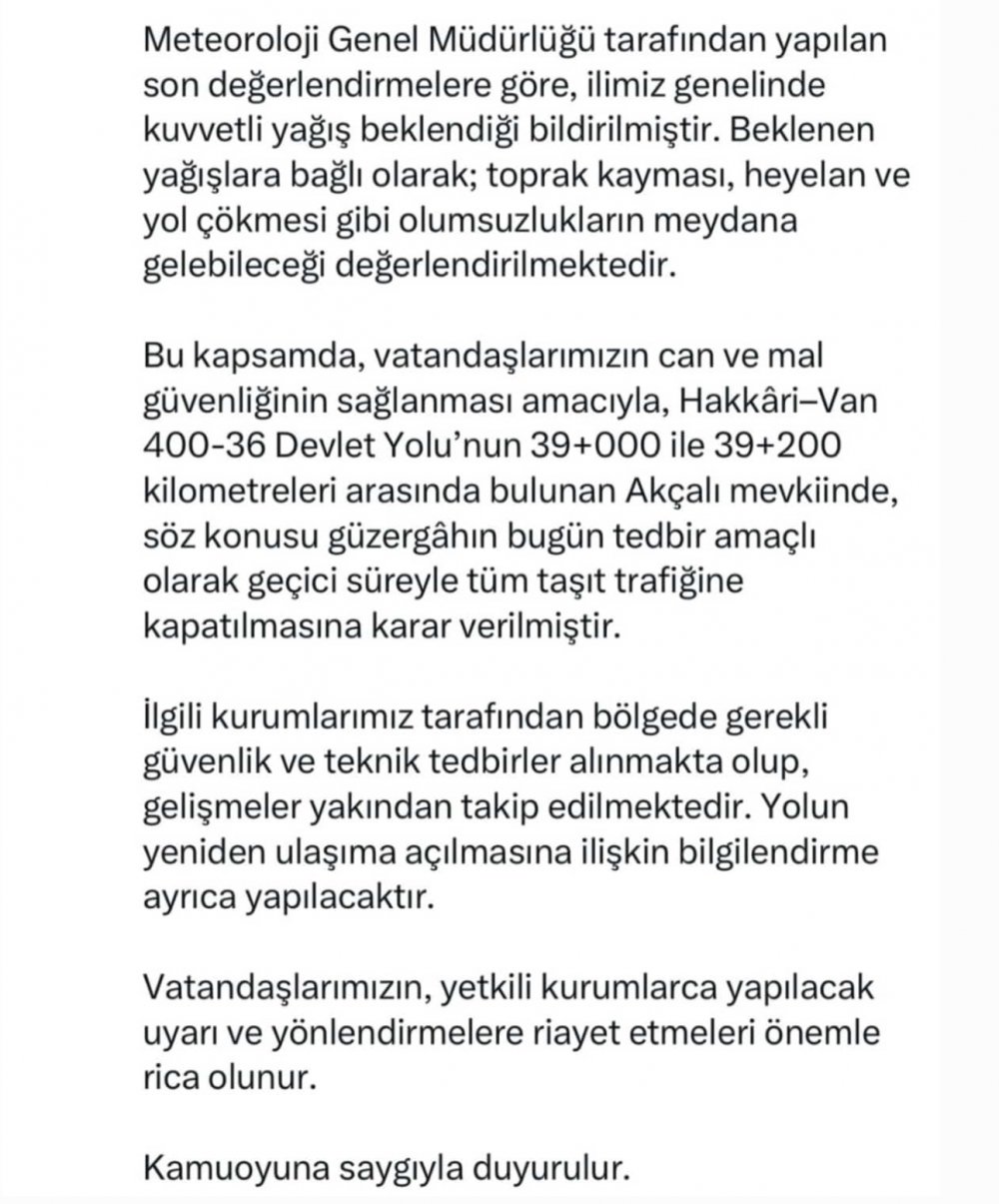Valilikten yapılan açıklamada, Hakkari–Van 400-36 Devlet Yolu üzerinde bulunan 39+000 ile 39+200 kilometreleri arasındaki Akçalı mevkii**, bugün itibarıyla tedbir amaçlı olarak tüm araç trafiğine kapatıldı.
