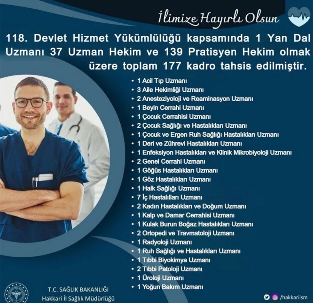 "118. Devlet Hizmet Yükümlülüğü Kapsamında İlimize 1 Yan Dal Uzmanı, 37 Uzman Hekim ve 139 Pratisyen Hekim Olmak Üzere Toplam 177 Kadro Tahsis Edildi. Yapılan kadro tahsislerinin Hakkari ilimize hayırlar getirmesini temenni ederek, Sayın Cumhurbaşkanımız Recep Tayyip Erdoğan ve Sağlık Bakanımız Sayın Prof. Dr. Kemal Memişoğlu’na şükranlarımızı arz ederiz" denildi.