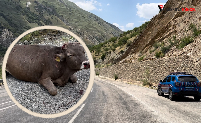 Hakkari-Yüksekova yolu üzerindeki 500 metrelik bir kayalıktan düşen inen ağır yaralanırken, olay yerine yetişen sahipleri ineği hemen kesti.