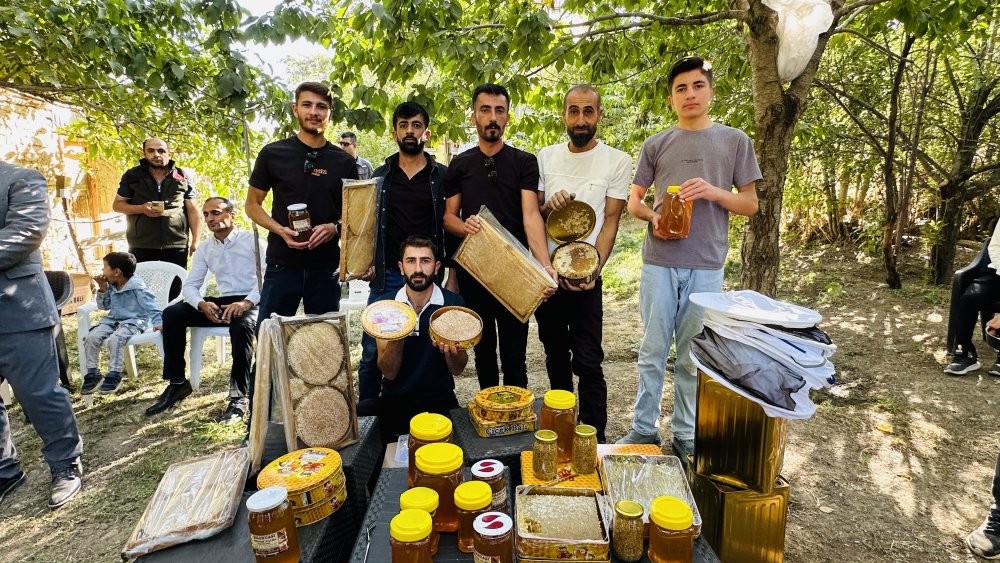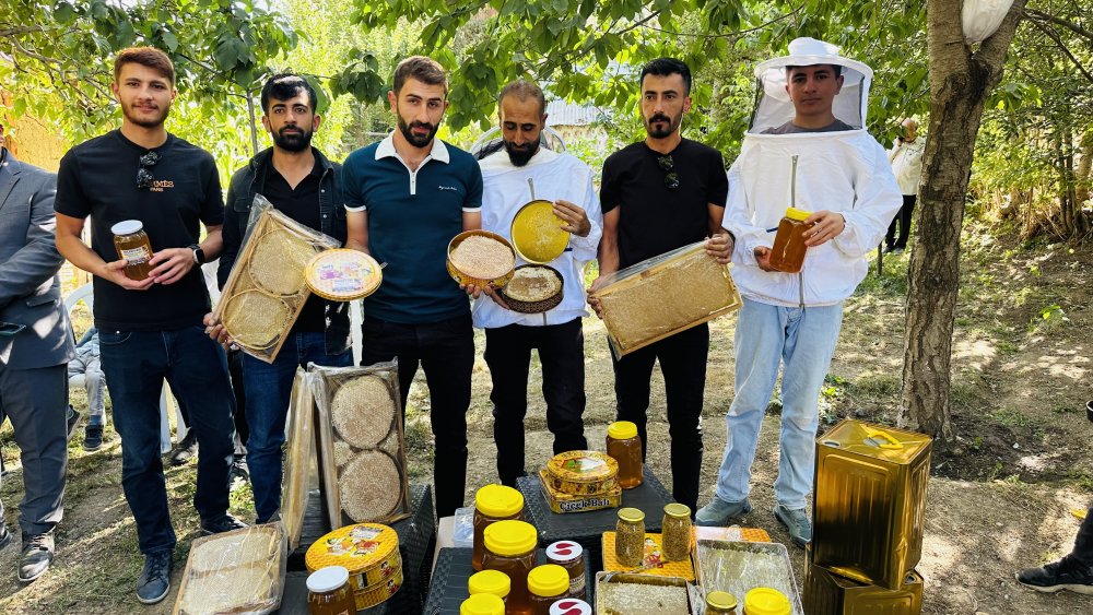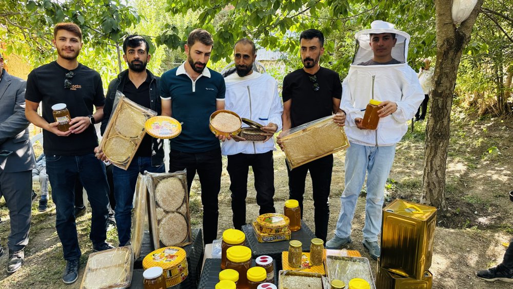 Köy meydanında kurulan stantlarda süzme bal, petek bal ve diğer arı ürünleri sergilenirken, üreticiler yetkililere ve misafirlere üretim süreci hakkında bilgi verdi.