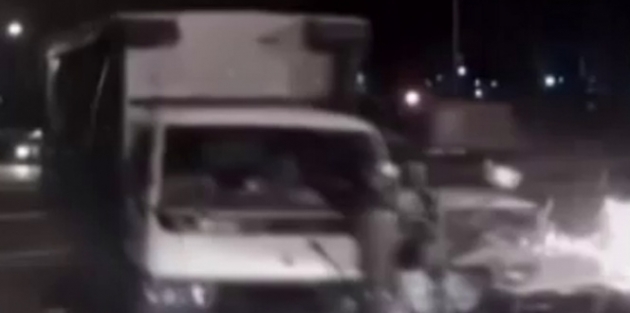 Hızla akan trafikte bir kamyonet sağ tarafa dönüş yaptığı anda karşıdan hızla gelen otomobille çarpıştı. Feci kaza sonrası kamyonet sürücüsü ön camdan fırlayarak aşağı sarktı. Hurdaya dönen otomobil ise alev alarak yanmaya başladı. Kazada ölü ya da yaralı olup olmadığı ise bilinmiyor./İha