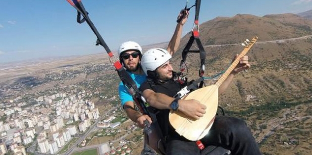 Kayseri'de imam Mustafa Güneş (23), yamaç paraşütü ile kentin semalarında gezerken, hem bağlama çaldı hem de 'Gesi Bağları' türküsünü seslendirdi.