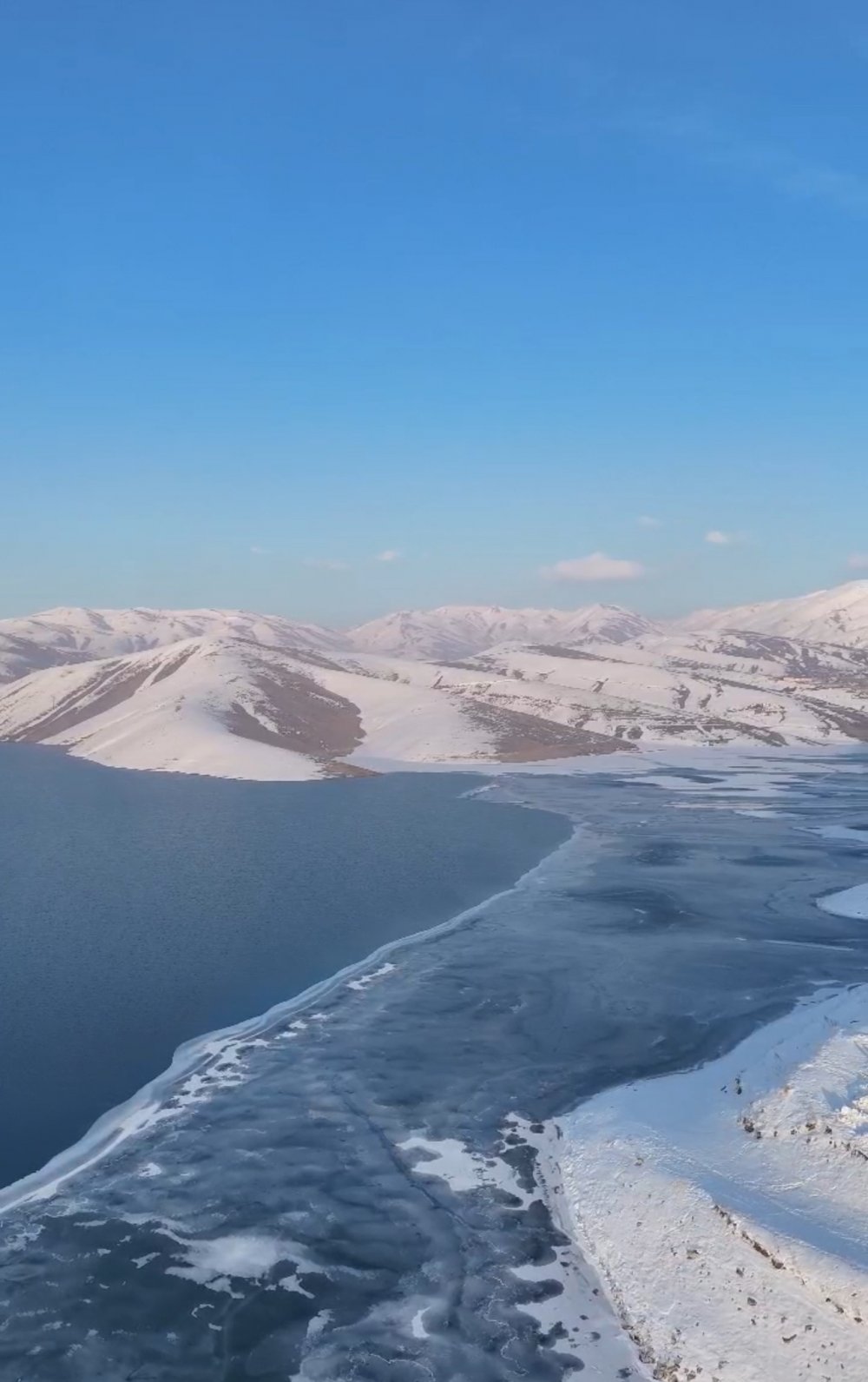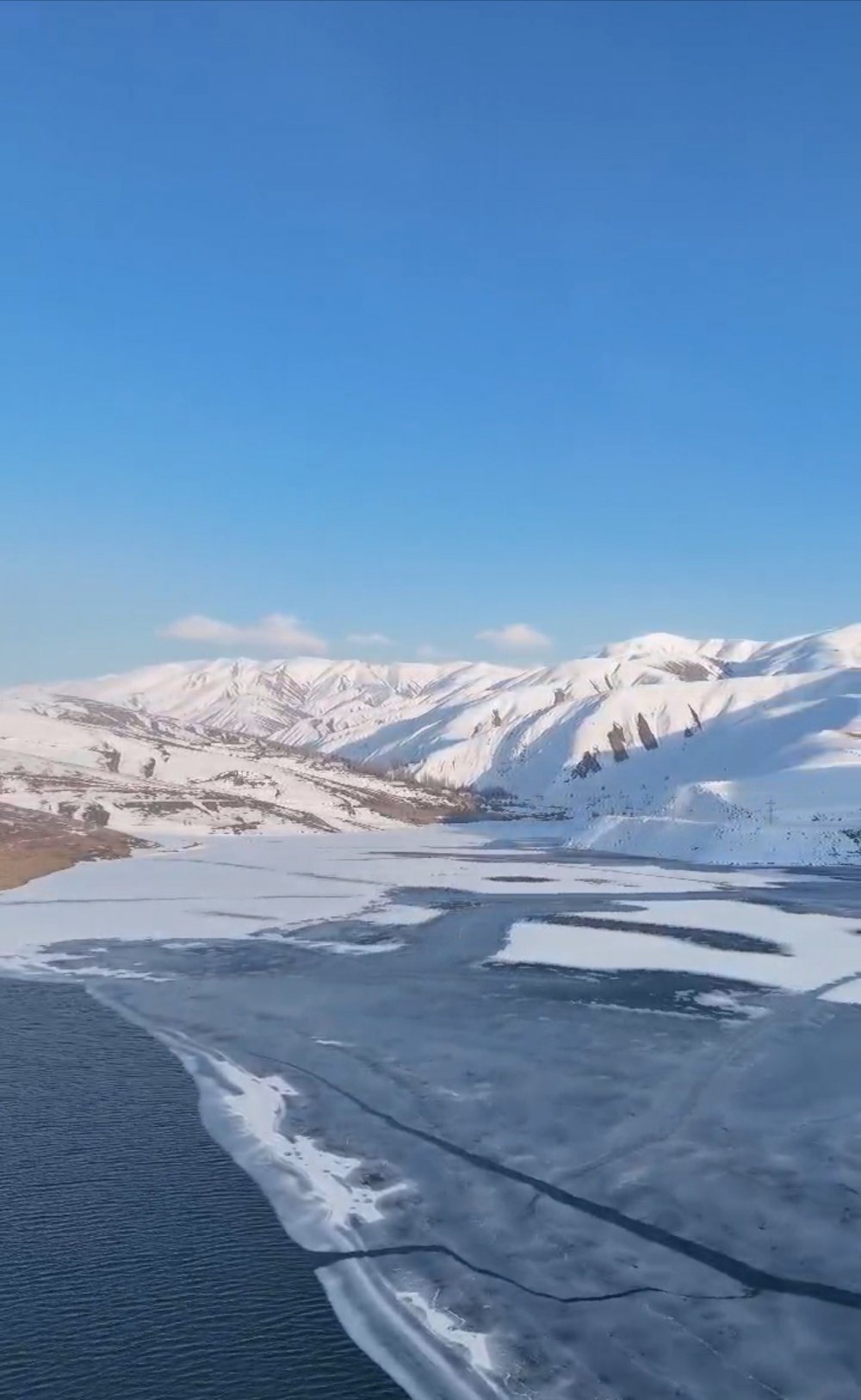 Yüksekova ilçesinde bulunan Dilimli Barajı’nın yüzeyi, aşırı soğuklar nedeniyle kısmen dondu. Doğasever Hakan Zanyar Aykut tarafından drone ile görüntülendi.