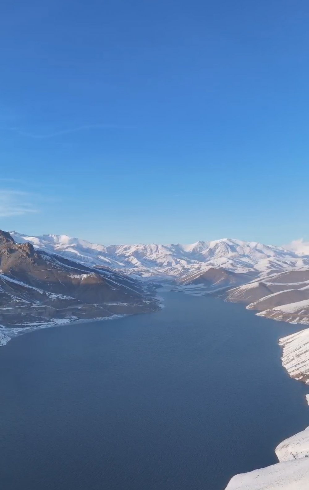Doğasever Hakan Zanyar Aykut, kısmen buz tutan Dilimli Barajı’nın karlı dağlarla bütünleşen görüntüsünü drone ile görüntüledi.