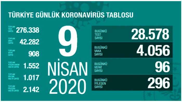 Bakanlığın verilerine göre, son 24 saatte 28 bin 578 test yapıldı ve 4 bin 56 yeni tanı kondu. Son 24 saatte Kovid-19 nedeniyle 96 hasta hayatını kaybetti.Açıklanan son rakamlarla birlikte Türkiye'de koronavirüs nedeniyle ölenlerin sayısı 908'e, toplam vaka sayısı ise 42 bin 282'ye yükseldi.