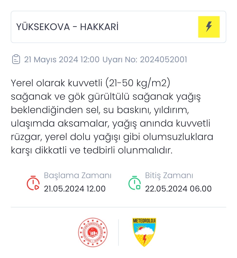 Yağışların etkili olduğu Hakkari ve ilçeleri için Meteoroloji Genel Müdürlüğü tarafından bir uyarı daha yapıldı.
