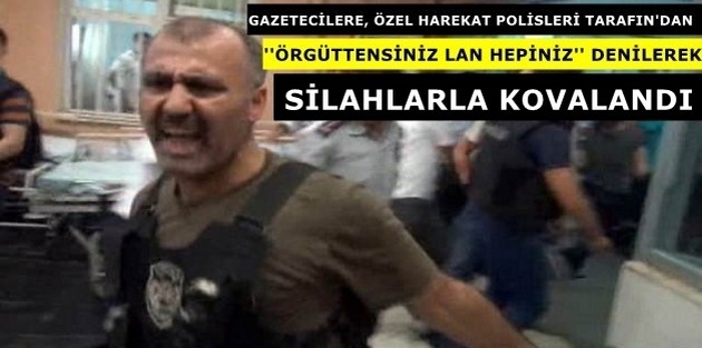Bir taneniz kalmasın. Defol lan" şeklinde hakaretlerle havaya ateş ederek kovalandı. Olayda 2 gazeteci yaralanırken polisler bir gazetecinin çektiği görüntü ve fotoğraflara el koyup, fotoğraf makinesini kırdı./Ajanslar
