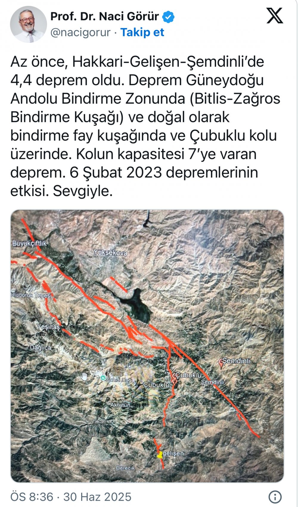 Depremin ardından sosyal medya hesabından detaylı bir değerlendirme yapan Prof. Dr. Naci Görür, şu ifadeleri kullandı: "Az önce, Hakkari-Gelişen-Şemdinli’de 4,4 deprem oldu. Deprem Güneydoğu Anadolu Bindirme Zonu'nda (Bitlis-Zağros Bindirme Kuşağı) ve doğal olarak bindirme fay kuşağında ve Çubuklu kolu üzerinde. Kolun kapasitesi 7’ye varan deprem. 6 Şubat 2023 depremlerinin etkisi. Sevgiyle." Görür'ün bu açıklaması, bölgedeki fay hatlarının aktifliği ve deprem potansiyeli konusunda önemli bir uyarı niteliği taşıyor.