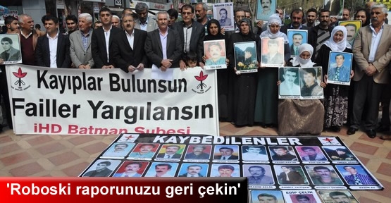 Künteş'ten sonra açıklama yapan İHD Batman Yöneticisi İlyas Ekinci, 216'ncı haftadır kayıplar bulunsun failler yargılansın talebiyle alanlarda olduklarını ifade ederek, 1990'lı yıllarda bölgede yaşanan kayıpların, işlenen failli meçhul cinayetler ile Roboski katliamının faillerinin ortaya çıkarılıp yargı önüne çıkarıncaya kadar alanlarda olmaya devam edeceklerini söyledi. 28 Aralık 2011 tarihinde Roboski sınır hattında TSK savaş uçakları tarafından yapılan hava bombardımanı sonucu çoğu çocuk olmak üzere 34 sivil yurttaşın öldürüldüğüne dikkat çeken Ekinci, "TBMM İnsan Hakları İnceleme Komisyonu bünyesinde 9 Ocak 2012 tarihinde Alt Komisyon kurarak olayla ilgili araştırma ve incelemeye başlatmış. Ancak geçtiğimiz günlerde, sivil toplum kuruluşları ve muhalefetin eleştiri ile itirazları dikkate alınmadan oy çokluğu ile onaylamıştır. Raporun sonuç bölümünde olayın kasten yapıldığına yönelik herhangi bir delil elde edilemediği görüş ve kanaatine ulaşıldığı belirtilmiştir. Raporun kendi içinde çelişkilerle dolu olduğu maddi gerçekliği gizlemeye dönük ve olayda sorumluluğu bulunan askeri ve sivil yetkilileri aklama gayreti içerisinde yazıldığı anlaşılmaktadır" dedi.