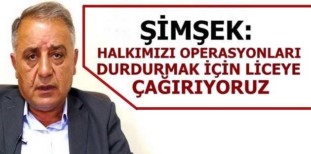 Diyarbakır halkını saldırıları durdurmak için çaba göstermeye çağıran Şimşek, Diyarbakır halkına şu çağrıyı yaptı: "Bütün halkımızı Lice'de devam eden kuşatmayı, Lice ve Sise'de yapılan operasyonları durdurmak üzere Lice'ye davet ediyoruz. Halkımızın kutsal değerlerine karşı sorumluluklarını yerine getirmesi gerekiyor."/DİHA