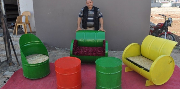 Suriye’nin Halep kentinde demirci ustası olarak çalışırken, iç savaş nedeniyle 4 yıl önce ailesini de alarak Türkiye’ye gelen ve Reyhanlı’da yaşamaya başlayan demirci ustası İbrahim Hacı Taha, önce kapı, pencere demirleri ve çatı işleriyle uğraştı. Ancak, kapı, pencere ve çatı işlerinin bir gün biteceğini düşünerek, boş varillerden koltuk ve masa yapmaya başladı. Kendisiyle çalışan ve 5 kişinin de geçimine katkı sağlamak amacıyla farklı bir şey bulma çabası içerisine girdiğini söyleyen Taha, “Bir anda çevrede işe yaramayan boş varilleri gördüm. Topladım veya satın aldım. Sonra da bunları keserek, kaynak yaparak koltuk, sandalye masa haline getirdim. Özellikle çay bahçeleri, parklarda kullanılacak hale gelince de satarak hem kendi aileme ve hem de yanımda çalışan 5 kişinin geçimine katkı sağlamaya başladım” dedi.