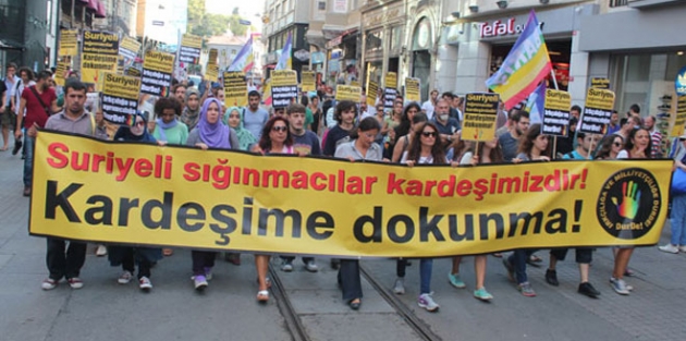 DurDe Platformu üyeleri saat 19.00’da Taksim Galatasaray Lisesi önünde toplanarak ‘Suriyeli sığınmacılar kardeşimizdir. Kardeşime dokunma’ yazılı pankartı açarak ‘Suriye halkı yalnız değildir’, ‘Sınırlar açılsın, göçmenlere özgürlük’ sloganları attı.