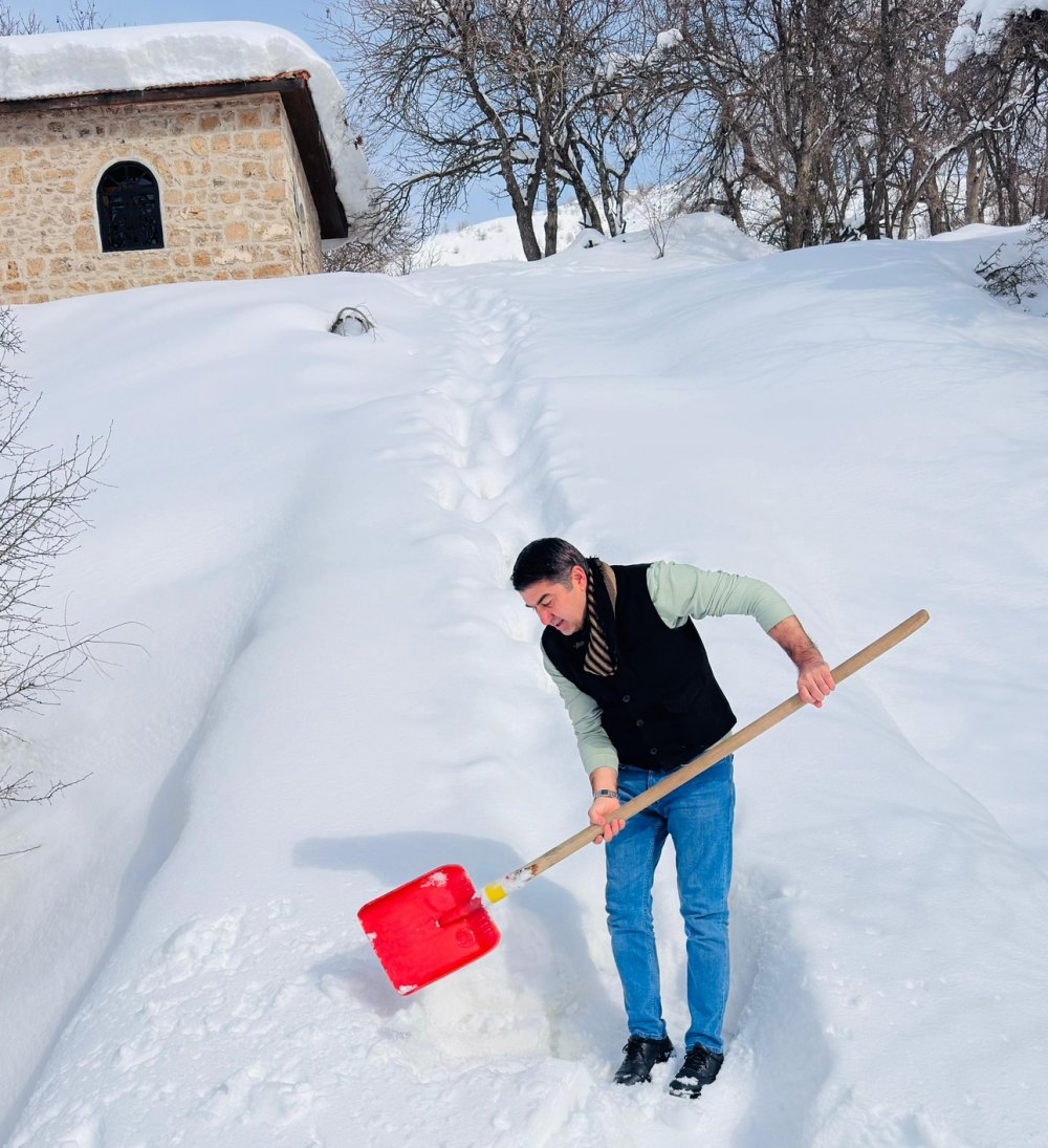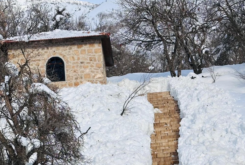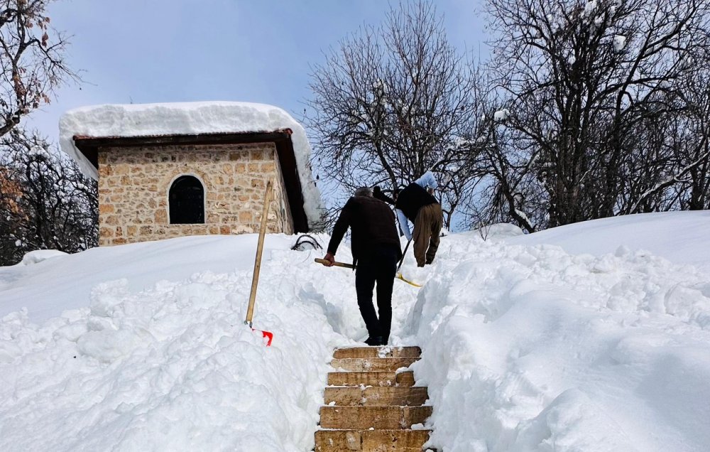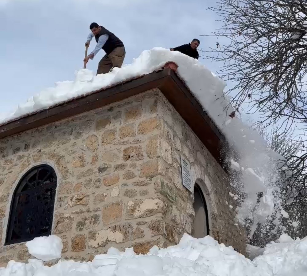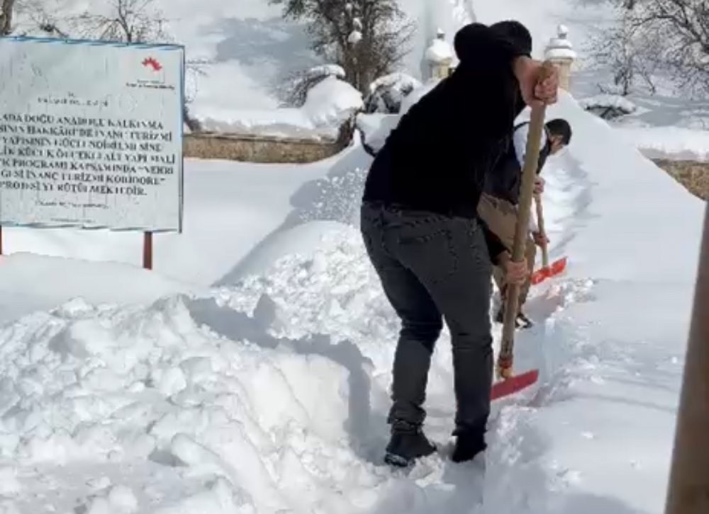 Muhtar ve imam, önce türbelere giden 50 metrelik yolu açtı, ardından binaların çatısında biriken yaklaşık 1 metre yüksekliğindeki karı küreklerle temizledi.