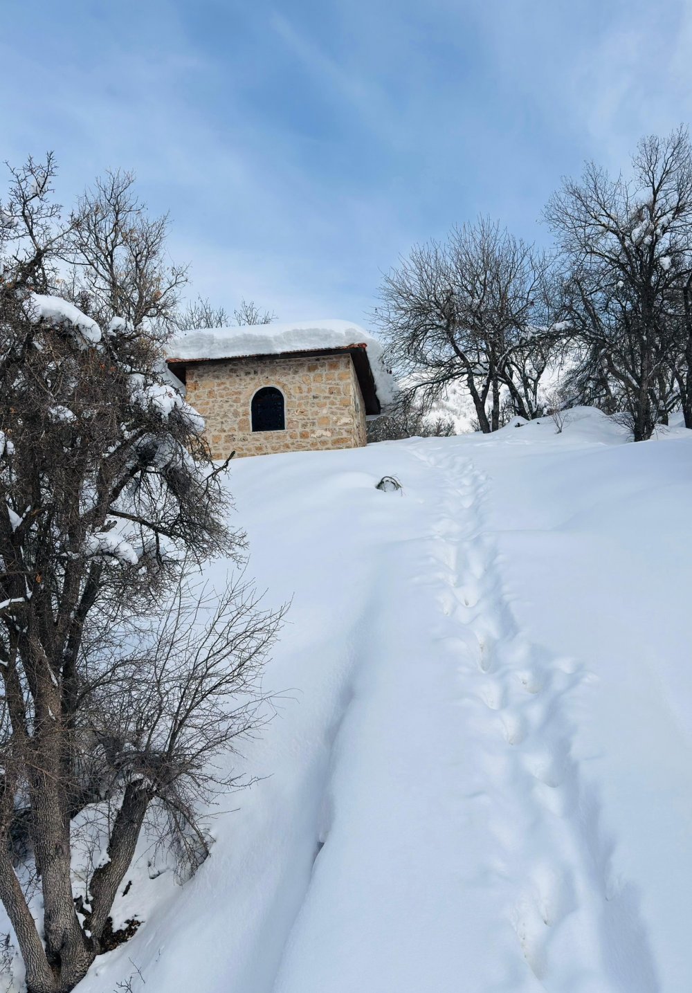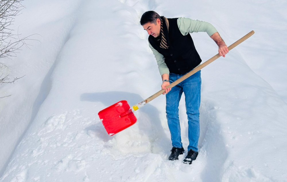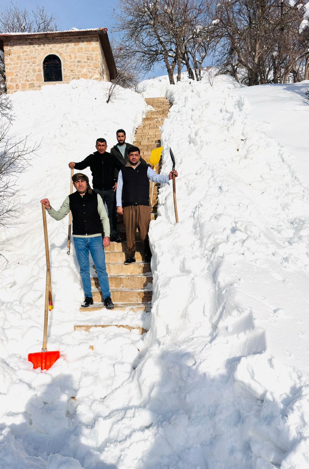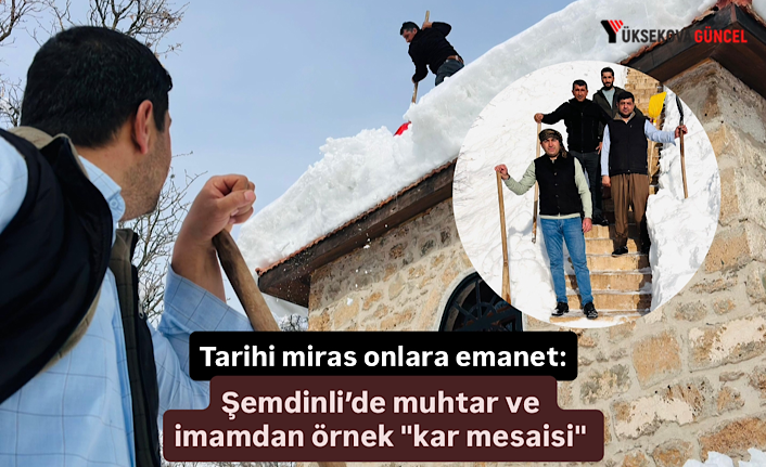 Muhtar ve imam, önce türbelere giden 50 metrelik yolu açtı, ardından binaların çatısında biriken yaklaşık 1 metre yüksekliğindeki karı küreklerle temizledi.