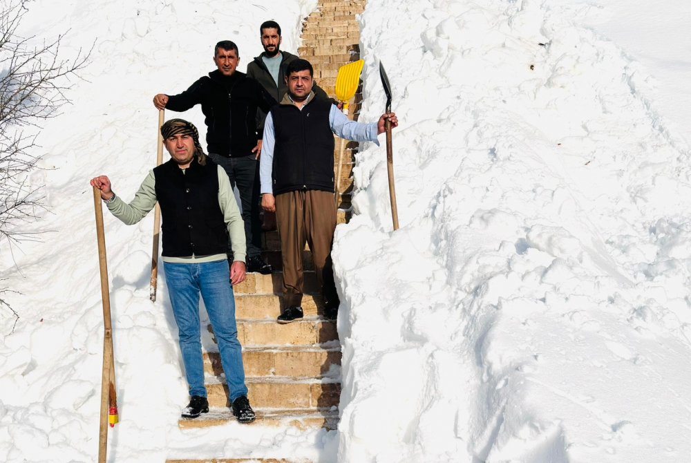 Şemdinli ilçesinde etkili olan yoğun kar yağışının ardından, Bağlar (Nehri) köyündeki tarihi türbelerin çatısında biriken kar kütleleri, köy muhtarı ve imamı tarafından temizlendi.