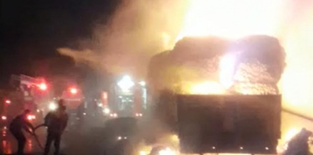Sakarya'nın Arifiye ilçesi TEM Otoyolu'nda, TIR'ın patlayan lastiğinin tutuşması sonucu elyaf yüklü dorse alev alev yandı. TEM Otoyolu Ankara istikameti ulaşıma kapanırken, itfaiye ekipleri yangını güçlükle söndürdü.