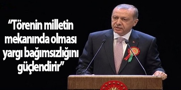 Törende konuşan Cumhurbaşkanı Recep Tayyip Erdoğan, törenin Beştepe’de yapılmasının yargı bağımsızlığına gölge düşüreceğine yönelik eleştirilere “Törenin milletin mekanında olması yargı bağımsızlığını güçlendirir” sözleriyle yanıt verdi.