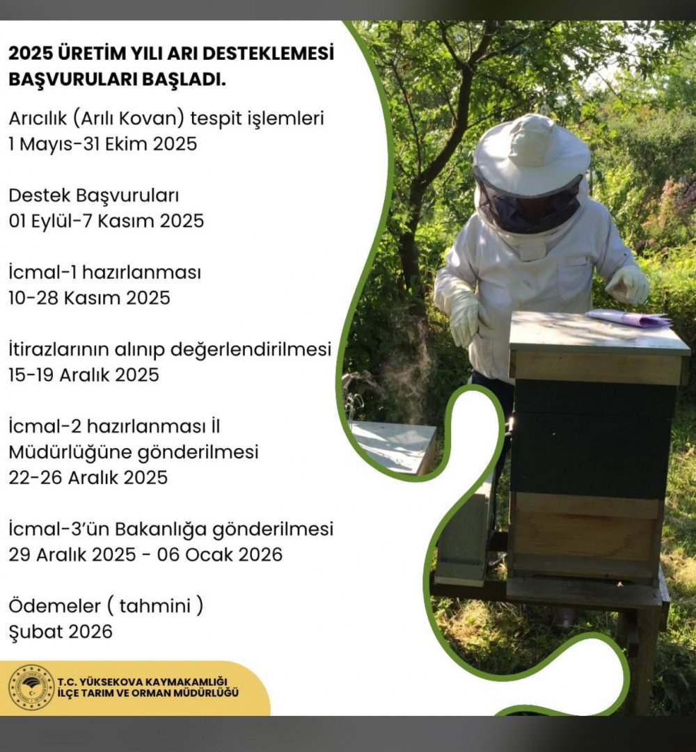 Arı yetiştiricilerine yönelik sağlanacak desteklemeler için başvuru takvimi belirlendi. İlk olarak, arıcılık faaliyetlerine ait tespit işlemleri 1 Mayıs - 31 Ekim 2025 tarihleri arasında yapılacak. Destek başvuruları ise 1 Eylül - 7 Kasım 2025 tarihleri arasında alınacak.