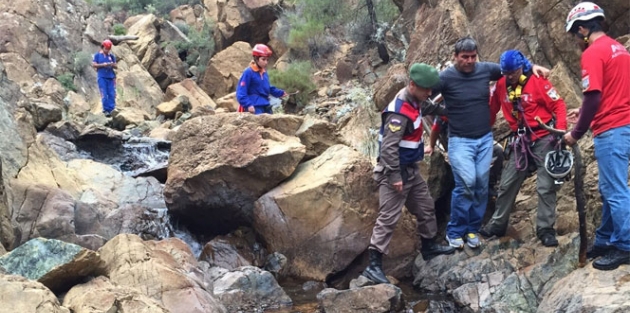 AKUT’dan 8, UMKE 6 ve Jandarma’dan 4 kişi olmak üzere toplam 18 kişi mahsur kalan 3 kişiyi kurtarmak için dağlık alana hareket etti. Ekipler, 3 saatlik zorlu bir tırmanışın ardından işadamlarının bulunduğu alana ulaşmayı başardı. Sarp kayalıklar ve sık ormanlık alan olması nedeniyle ekipler, yaralı kazazedeyi sedye yerine kollarına girerek taşıdı. 8 saat süren zorlu bir yolculuğun ardından biri yaralı üç işadamı Karadere Mevkii’ne indirildi. Sağlık ekiplerinin ilk müdahalesi sonrası işadamları ambulansla Özel hastaneye götürüldü. Tedavisi yapılan üç işadamının sağlık durumunun iyi olduğu öğrenildi. İşadamları kendilerini kurtarmaya gelen ekiplerle beraber öz çekim yaptı./İha