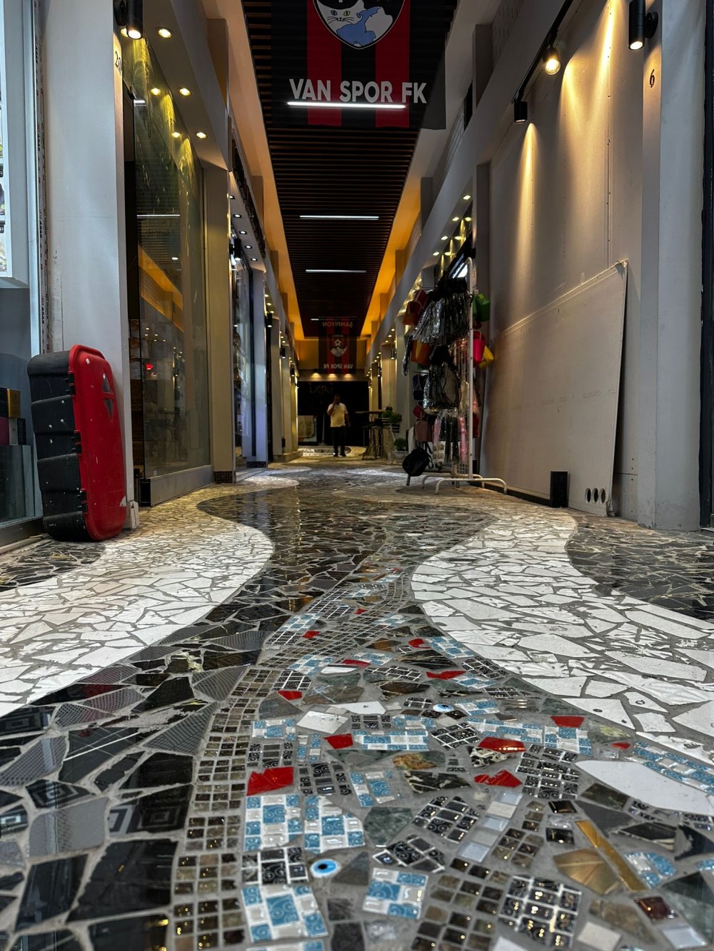Çarşı esnafı, çöpe atılmak üzere olan eski seramik parçalarını toplayarak yaklaşık bir ay süren titiz bir çalışmayla çarşının zeminlerini canlı mozaik desenleriyle süsledi. İnşaat malzemeleri satan dükkanlardan temin edilen bu atıklar, el emeğiyle yeniden hayat bularak çarşıya eşsiz bir estetik kattı. Bu, geri dönüşümle sanatı birleştiren öncü bir proje olarak Van'da ses getirdi.