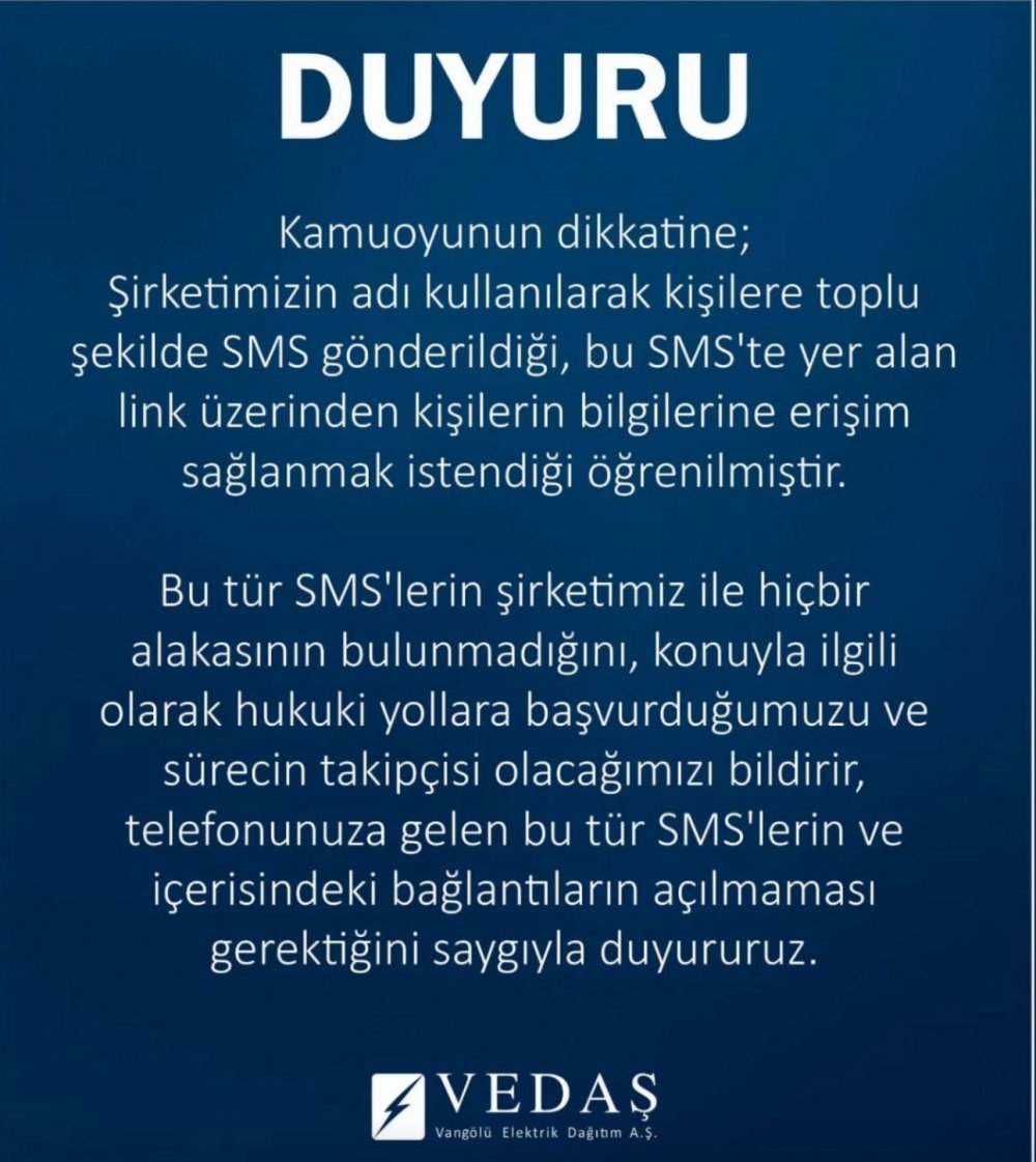 Vangölü Elektrik Dağıtım A.Ş. (VEDAŞ) kamuoyuna yaptığı duyuruda: "Kamuoyunun dikkatine; şirketimizin adı kullanılarak kişilere toplu şekilde SMS gönderildiği, bu SMS'te yer alan link üzerinden kişilerin bilgilerine erişim sağlanmak istendiği öğrenilmiştir. Bu tür SMS'lerin şirketimiz ile hiçbir alakasının bulunmadığını, konuyla ilgili olarak hukuki yollara başvurduğumuzu ve sürecin takipçisi olacağımızı bildirir, telefonunuza gelen bu tür SMS'lerin ve içerisindeki bağlantıların açılmaması gerektiğini saygıyla duyururuz" ifadelerini kullandı.