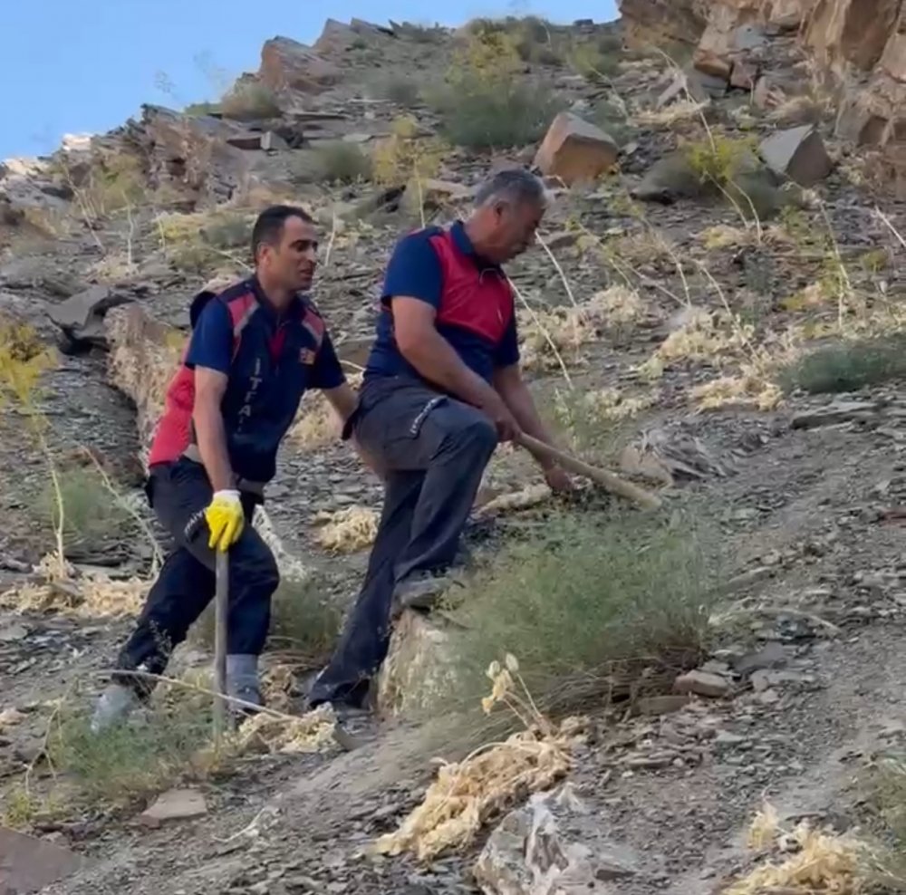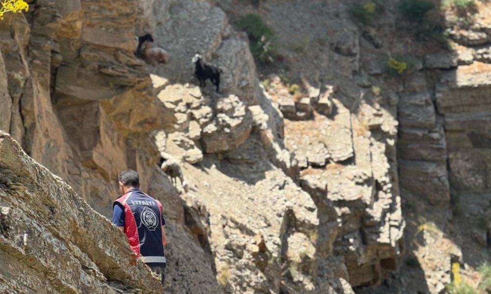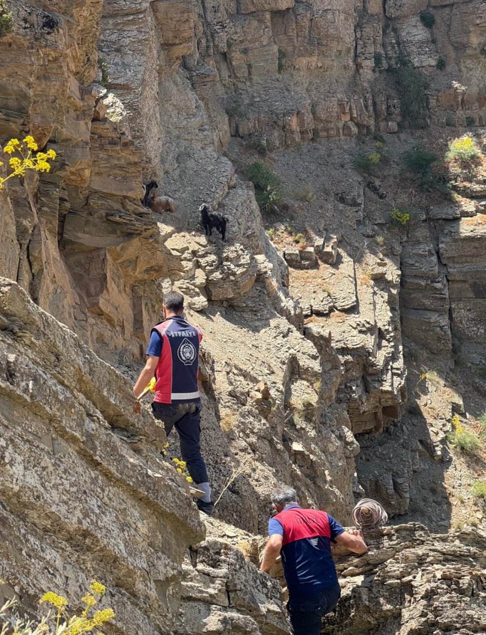 Yaklaşık beş saat süren yoğun çalışmalar sonucunda, dağın sarp yamacında mahsur kalan yedi koyun güvenli bir şekilde kurtarıldı.
