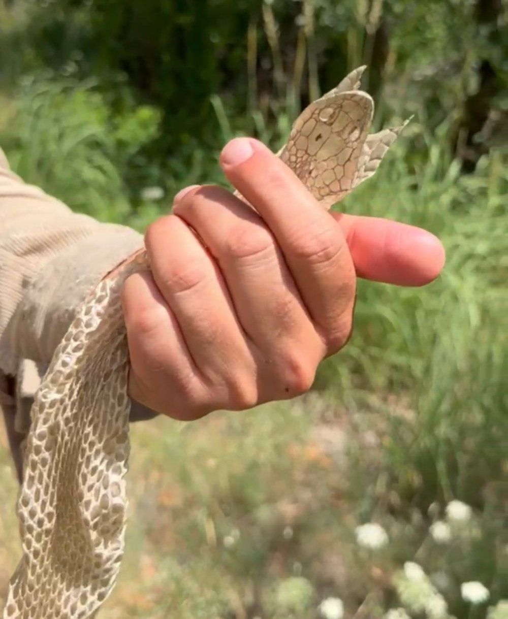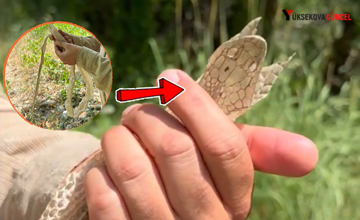 Yüksekova ilçesinde, doğa gözlemcisi öğretmen Ümit Bartın, Türkiye’nin en zehirli yılan türlerinden birine ait olduğu değerlendirilen bir yılan derisi buldu.